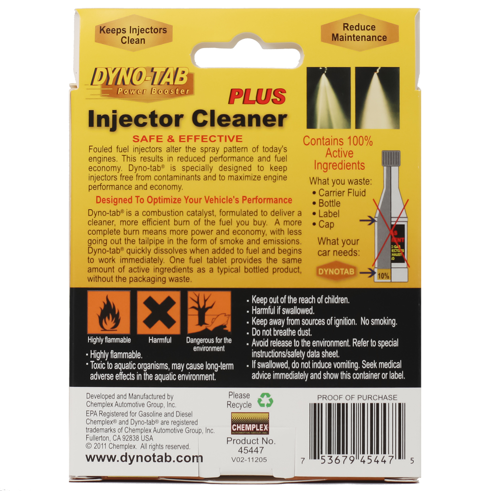 Use Dyno-tab® Plus Injector Cleaner to keep your fuel injectors clean and functioning properly to get all the power and performance from the fuel you buy. This economic package contains 12 powerful 1-gram tablets. Fast dissolving!