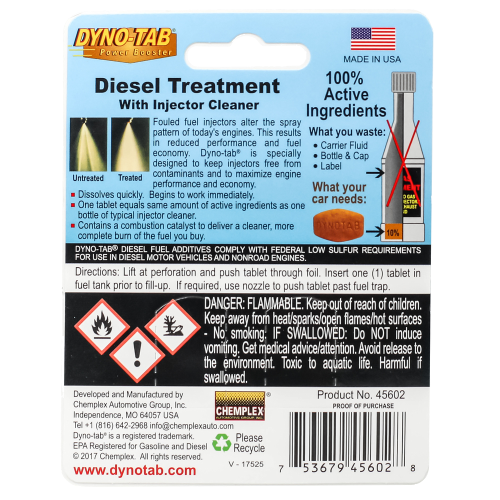| Product Name | Dyno-tab® Diesel Treatment with Injector Cleaner 45602 | For Diesel Engine ONLY | 2 Tablets Crad 1 Tablet Treats 60 Liters |