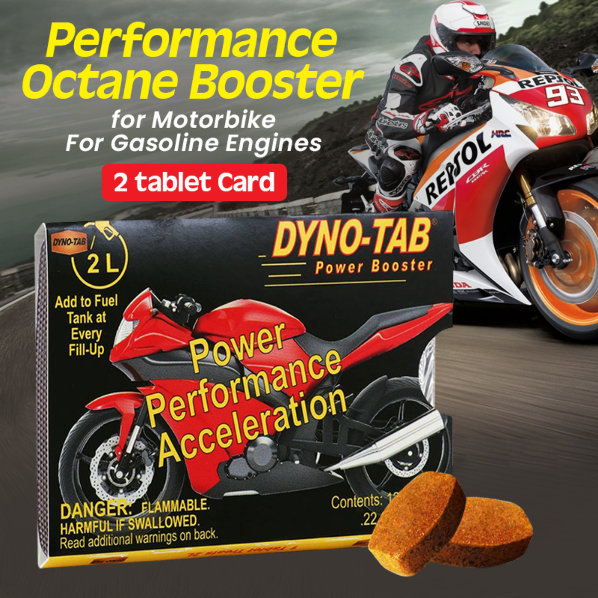 | Product Name | Dyno-tab® 8L Power Pack Octane Booster – 45438 - for Gasoline Bikes and Motorcycles ONLY | 2-Tablets Pouch | 1 Tablet Treats 4 Liters |